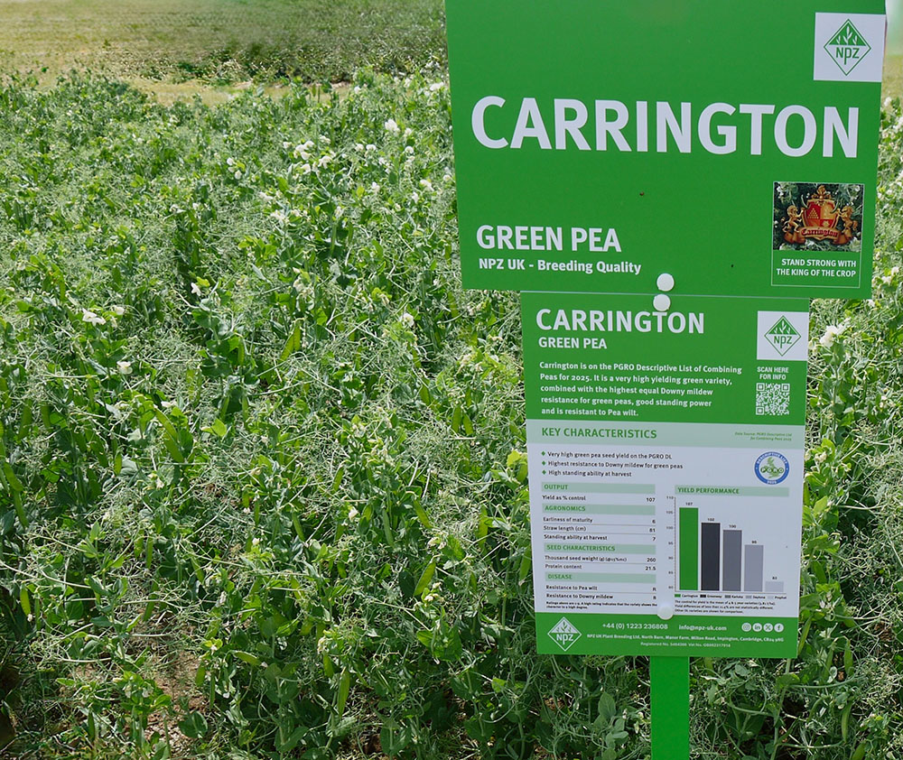 Carrington is one of five NPZ UK Green pea varieties on the PGRO DL, emphasising the breeder’s strong portfolio in combining peas for growers. It shares its DL recommendation with Pangea, Butterfly and Bluetime. These were joined on the latest list by Bullet, a new high yielding variety,